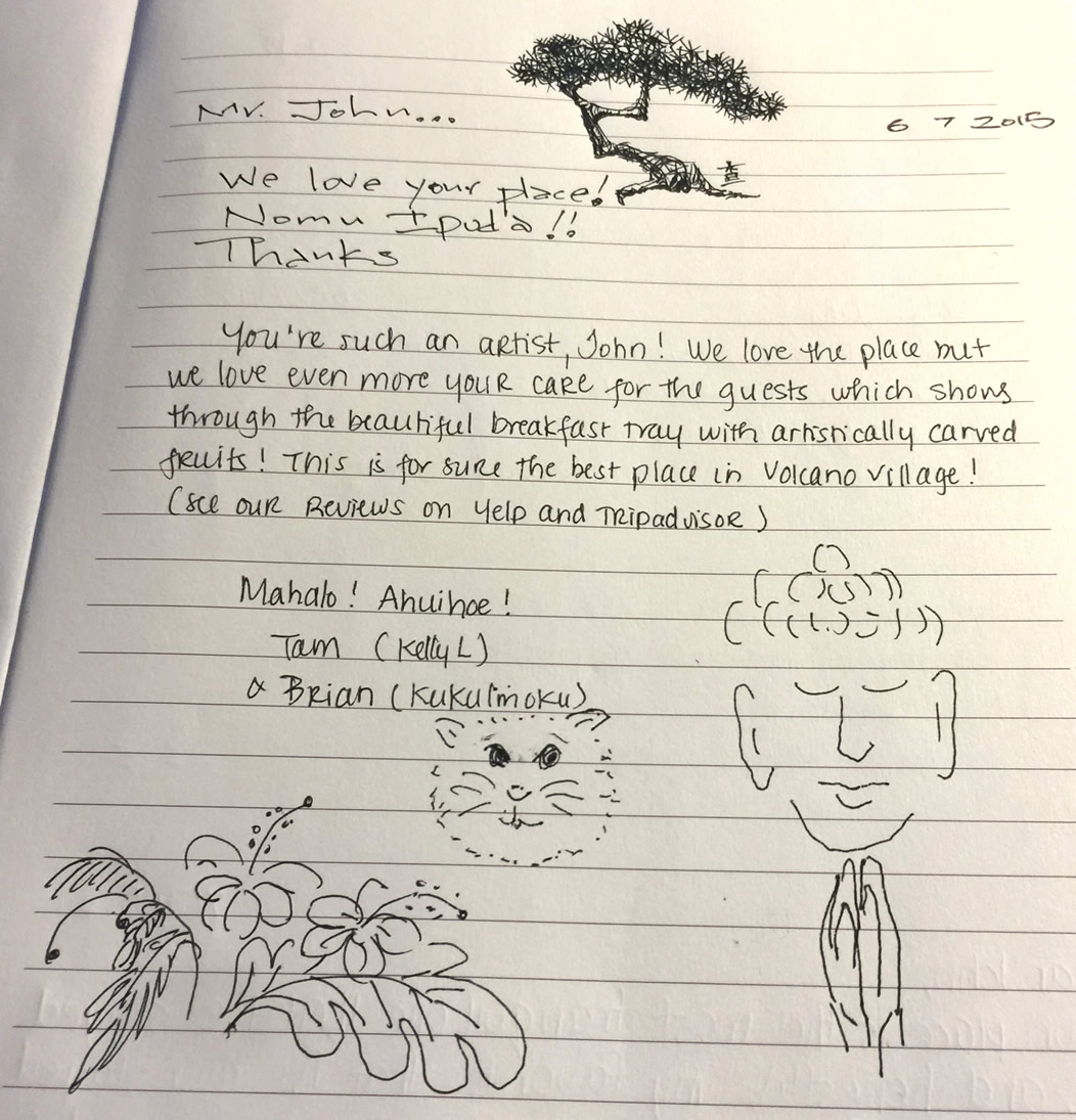 Mr. John… we love your place! Nomu Ipuda!! Thanks